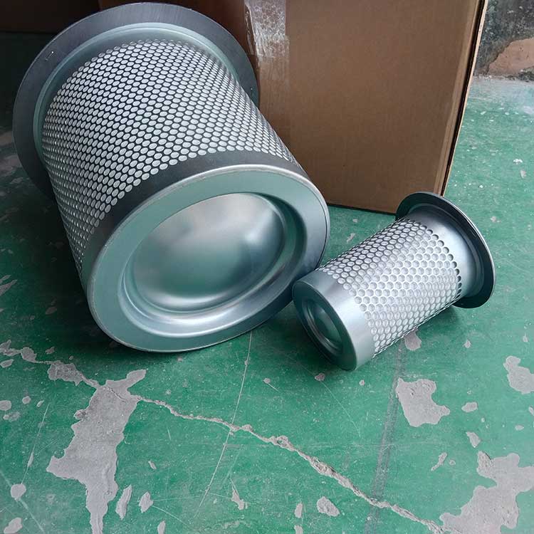 油氣分離元件是決定空壓機壓縮空氣品質的關鍵部件,高質量的油氣分離元件不僅可保證壓縮機的高效率工作,且濾芯壽命可達數千小時。從壓縮機頭出來的壓縮空氣夾帶大大小小的油滴,大油滴通過油氣分離罐時易分離,而小油滴(直徑1μm以下懸浮油微粒)則必須通過油氣分離濾芯的微米級玻纖濾料層過濾。油微粒經過濾材的擴散作用,直接被濾材攔截以及慣性碰撞凝聚等機理使壓縮空氣中的懸浮油微粒很快凝聚成大油滴,在重力作用下油凝聚在油分芯底部,通過底部凹處回油管進口返回機頭潤滑油系統,從而使壓縮機排出更加純凈無油的壓縮空氣。壓縮空氣中的固體粒子經過油分芯時滯留在過濾層中,這就導致了油分芯壓差(阻力)不斷增加。隨著油分芯使用時間增長,當油分芯壓差達到0.08到0.1Mpa時,或者壓縮空氣出口產生明顯的含油量時,濾芯必須更換,否則增加壓縮機運行成本(耗電或耗油)。